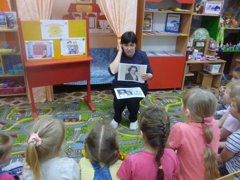 В беседе «Поделись своей добротой» воспитатель Косарева Т.С. рассказала о талантливом музыканте Людвиге ван Бетховене, он плохо слышал с юношеских лет, а к концу жизни совершенно оглох. Но он все же нашёл выход и научился слышать музыку при игре на фортепиано, художниках, которые писали свои картины не имея рук, рассказала о подвиге героя войны Алексее Петровиче Маресьеве.