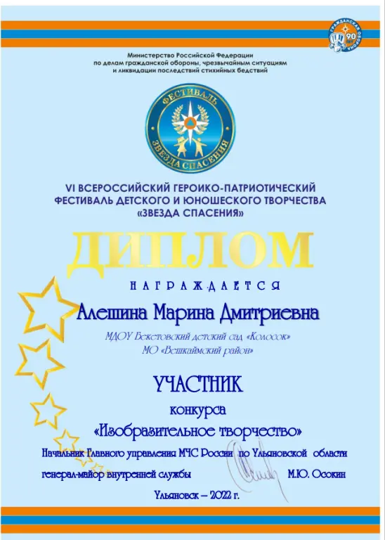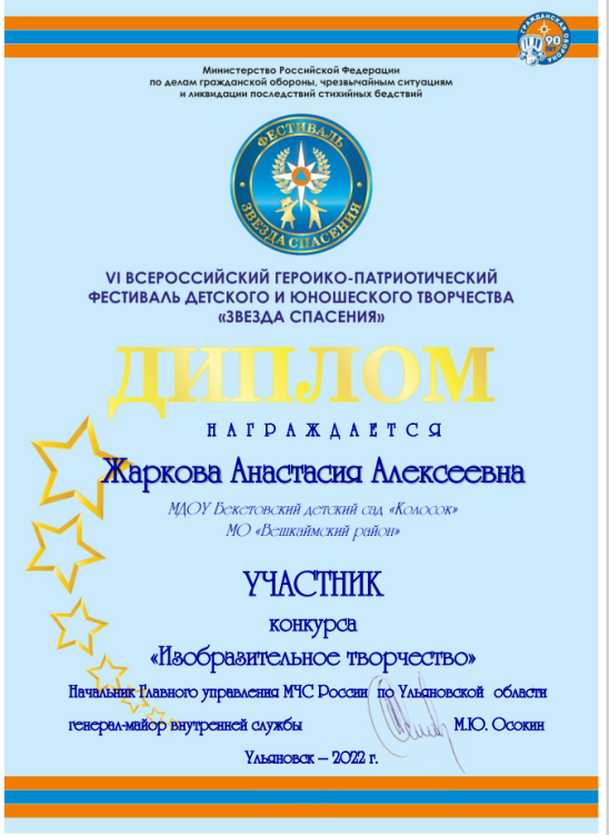 Дипломами участника конкурса «Изобразительное творчество» VI всероссийского героико-патриотического фестиваля «Звезда спасения» награждены Алёшина Марина, Герус Ангелина, Жаркова Настя, Статёнин Илья, Константинов Егор, руководитель воспитатель Пахомова Л.В. Спасибо всем нашим участникам конкурса!